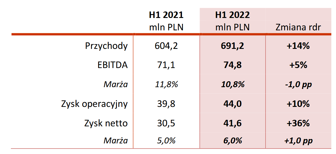 istotnego wzrostu kosztów w bieżącym roku), w całym pierwszym półroczu wynik netto zwiększył się o 36% rdr, do 41,6 mln zł. Z kolei przy przychodach wyższych o 14% rdr (691,2 mln zł) wynik EBITDA wzrósł o 5% rdr, do 74,8 mln zł.