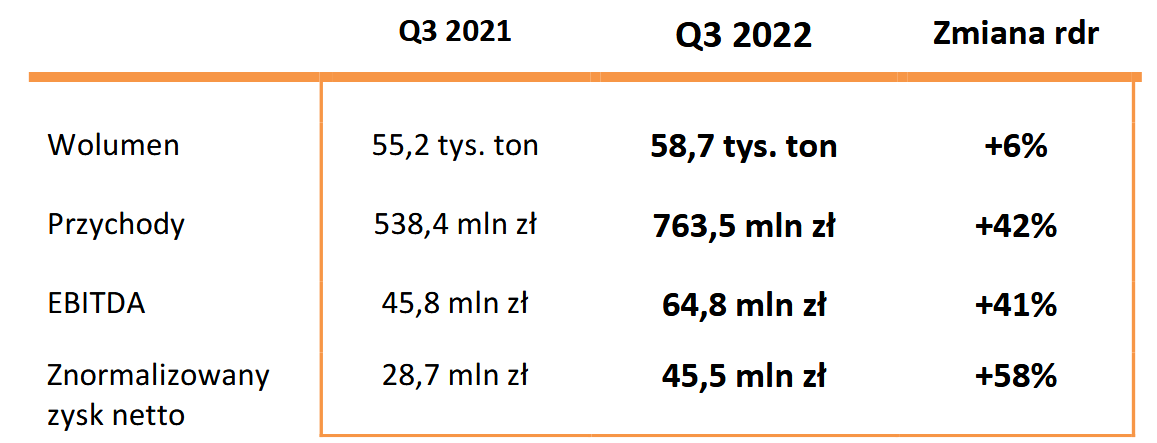 Grupa Alumetal wypracowała w trzecim kwartale br. 64,8 mln zł wyniku EBITDA (+41% rdr) oraz 58,7 mln zł zysku netto (+103% rdr), który po znormalizowaniu miał wartość 45,5 mln zł (+58% rdr). Sprzedaż 58,7 tys. ton wyrobów (+6% rdr), w połączeniu ze znaczącym wzrostem cen, oznaczała wzrost przychodów o 42% rdr, do poziomu 763,5 mln zł. W rezultacie w okresie ostatnich czterech kwartałów Grupa Alumetal zanotowała 272 mln zł zysku EBITDA i 192 mln zł znormalizowanego zysku netto przy wolumenie sprzedaży 245,3 tys. ton i przychodach ze sprzedaży przekraczających 3,1 mld zł.