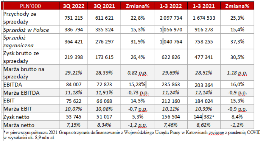 Za sam III kwartał przychody Grupy przekroczyły 751,2 mln zł (+22,8% r/r), EBITDA wyniosła 84 mln zł (+15,3% r/r), a zysk netto był na poziomie 53,7 mln zł (+5,3% r/r).