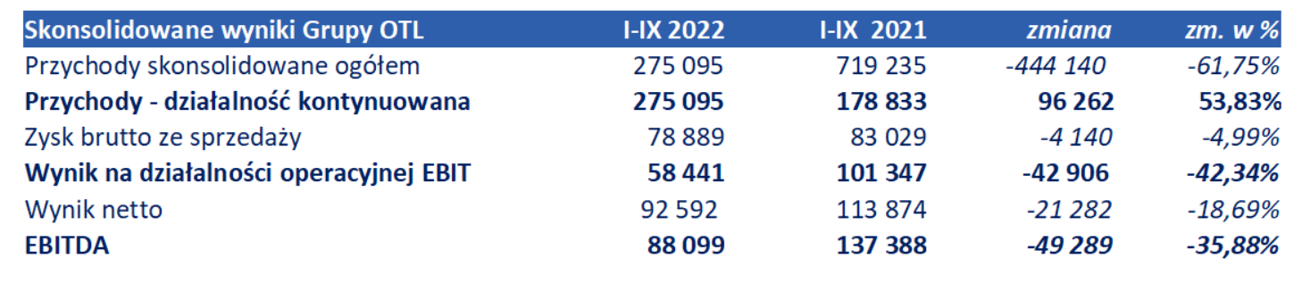 Grupa OTL po trzech kwartałach 2022 r. wygenerowała ponad 275 mln zł przychodów (vs 719,24 mln zł r/r) i odnotowała 92,6 mln zł zysku netto (vs 113,87 mln zł r/r). Spadek wynikał z wyłączenia z konsolidacji w roku 2022 wyników spółek sprzedanych w roku 2021. Przychody z działalności niekontynuowanej w 2022 r. wyniosły 540,4 mln zł po trzech kwartałach 2021 r.