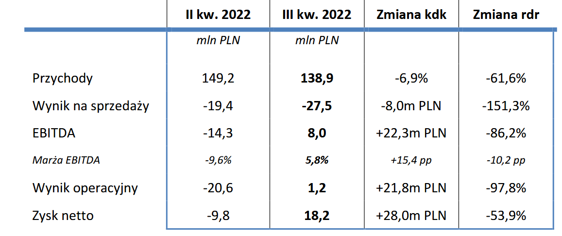 Grupa Mercator Medical zanotowała w okresie lipiec-wrzesień 2022 roku 138,9 mln zł przychodów, co oznacza niewielki spadek względem poprzedniego kwartału. Presja cenowa na rynku rękawic, związana z wciąż widoczną nadpodażą, poskutkowała jednak pogłębieniem straty na sprzedaży. Rozliczenie zaliczki wpłaconej przez kontrahenta segmentu produkcyjnego, który zrezygnował z realizacji zamówienia w obliczu zmiany sytuacji rynkowej, podbiło jednak skonsolidowany wynik operacyjny do wartości dodatnich. W rezultacie zysk EBITDA trzeciego kwartału wyniósł 8 mln zł i był o ponad 22 mln zł wyższy kwartał do kwartału. Z kolei dzięki wzrostowi przychodów finansowych zysk netto Grupy