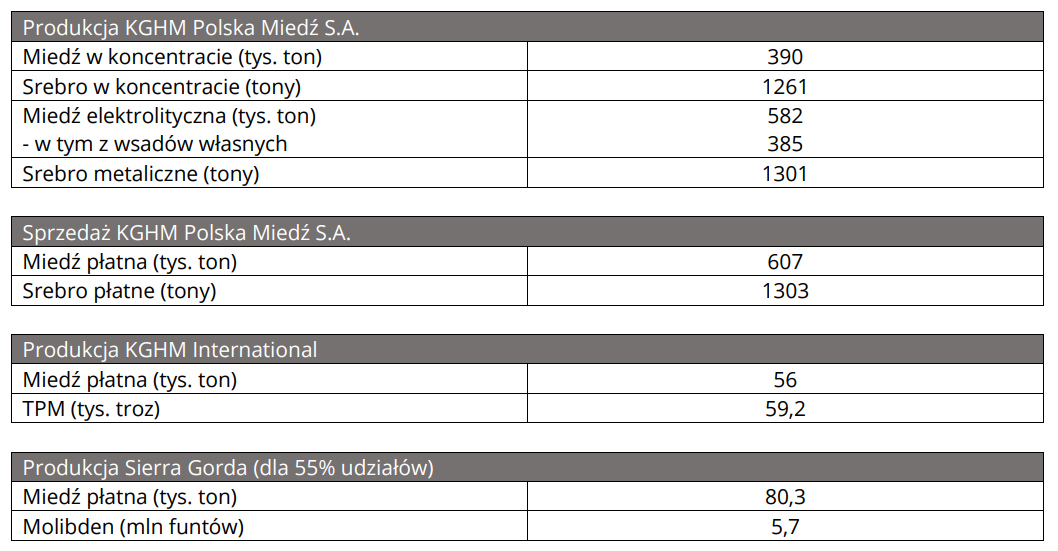 Plan produkcji kopalń KGHM Polska Miedź S.A. na przyszły rok zakłada wydobycie miedzi w urobku na poziomie zbliżonym do wielkości przewidywanej w 2022 roku. W zakresie srebra przewidywany jest wzrost produkcji w konsekwencji wykorzystania pełnych zdolności przerobowych przy niższej zawartości tego pierwiastka w urobku. Zakłada się wzrost jednostkowego kosztu produkcji miedzi elektrolitycznej ze wsadów własnych, głównie z tytułu wzrostu cen materiałów technologicznych, czynników energetycznych i paliw oraz stawek usług obcych przy zachowaniu zakresu rzeczowego kosztów.