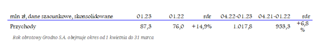 Zgodnie z najnowszymi szacunkami, przychody Grupy Grodno w styczniu wyniosły 87,3 mln zł, co oznacza wzrost o 14,9% wobec analogicznego miesiąca przed rokiem. Narastająco po dziesięciu miesiącach bieżącego roku obrotowego Grupa przekroczyła 1 mld zł sprzedaży, rosnąc o 6,8% rdr.