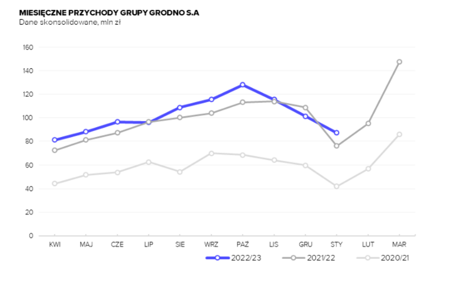 Ponad 1 mld zł przychodów narastająco za dziesięć miesięcy bieżącego roku obrotowego jest najlepszym rezultatem sprzedażowym za ten okres roku w historii firmy. Zarząd planuje utrzymanie dodatniej dynamiki wzrostu również w perspektywie całego roku obrotowego 2022/23, który Grodno zamknie z końcem marca.
