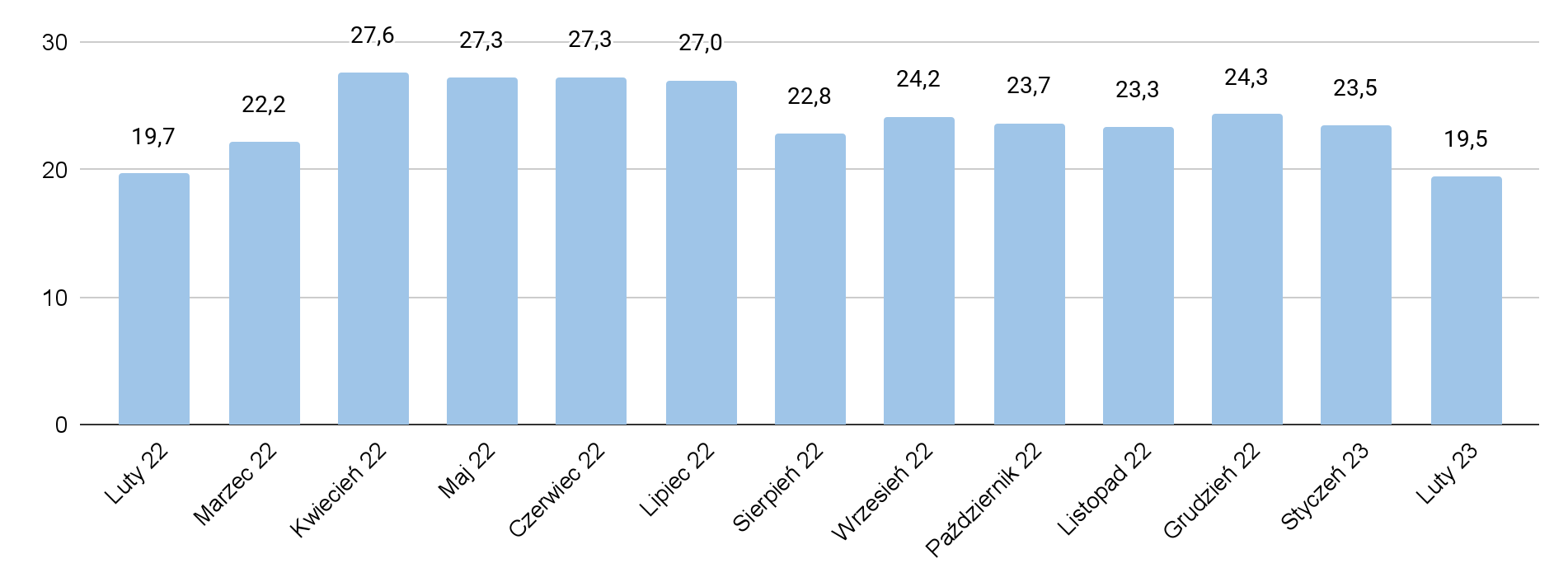 W lutym 2023 r. Grupa BoomBit miała 19,45 mln PLN (-17,4% m/m) przychodów z gier. Wydatki na User Acquisition wyniosły 10,80 mln PLN (-23,2% m/m), a koszty prowizji platform wzrosły do 2,53 mln PLN (+14,9% m/m). W rezultacie Grupa zanotowała w ostatnim miesiącu niższe przychody pomniejszone o UA i prowizje platform, które wyniosły 6,12 mln PLN (-21,6%) i miała łącznie 13,3 mln pobrań.