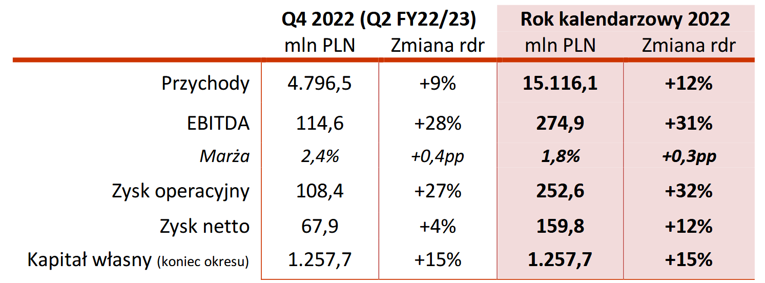 Największy dystrybutor IT i elektroniki użytkowej w Polsce oraz regionie CEE w roku kalendarzowym 2022 zwiększył obroty o prawie 1,7 mld zł, przekraczając próg 15 mld zł oraz zanotował również rekordowe wyniki finansowe. Transformacja cyfrowa społeczeństw, wielokierunkowy rozwój i najwyższa efektywności w branży pozwoliły na wypracowanie 275 mln zł rocznego wyniku EBITDA, a czwarty kwartał 2022 roku był już 18. kwartałem nieprzerwanych wzrostów w ujęciu rok do roku.