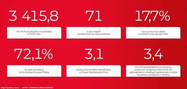 W nowym podejściu, zgodnym z wytycznymi GRI, zostały zaprezentowane także informacje odnoszące się do miejsca pracy, w tym rozwoju i edukacji pracowników, a także do zaangażowania społecznego. Ambicją Grupy jest wzmacnianie pozytywnego wpływu w przestrzeni społecznej – zarówno jako pracodawca i producent urządzeń AGD, jak i w odniesieniu do lokalnych społeczności. W 2022 roku Amica przekazała 3,4 mln zł na inicjatywy społeczne i programy, których beneficjentem są ogólnopolskie i lokalne społeczności.