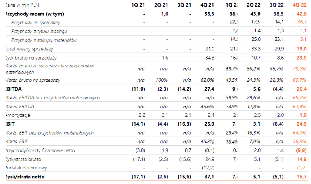 - 42,9 mln PLN przychodów, w tym 37,8 mln PLN przychodów ze sprzedaży (bez przychodów z zakupów materiałów)