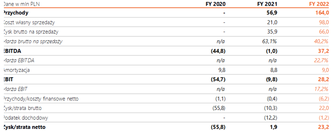 W 2022 roku Spółka wygenerowała 164,0 mln PLN przychodów, z czego 90,6 mln PLN z tytułu realizacji usługi na rzecz Novavax oraz 5,7 mln PLN komponentu leasingowego. Pozostałą część przychodów stanowi suma zakupionych materiałów (komponent bezmarżowy). Mabion uzyskał bardzo dobrą rentowność na świadczonych usługach osiągając 68,5%. Na poziomie EBITDA Spółka zanotowała wynik w wysokości 37,2 mln PLN i marżowość na poziomie 22,7% w porównaniu do straty -1,0 mln PLN w 2021 roku. Zysk netto wyniósł 23,2 mln PLN i znacząco wzrósł względem roku 2021, w którym wygenerowano 1,9 mln PLN, w tym 12,2 mln PLN z tytułu utworzonego aktywa podatkowego. W ciągu całego 2022 roku Mabion wygenerował 38,8 mln PLN przepływów pieniężnych netto z działalności operacyjnej.