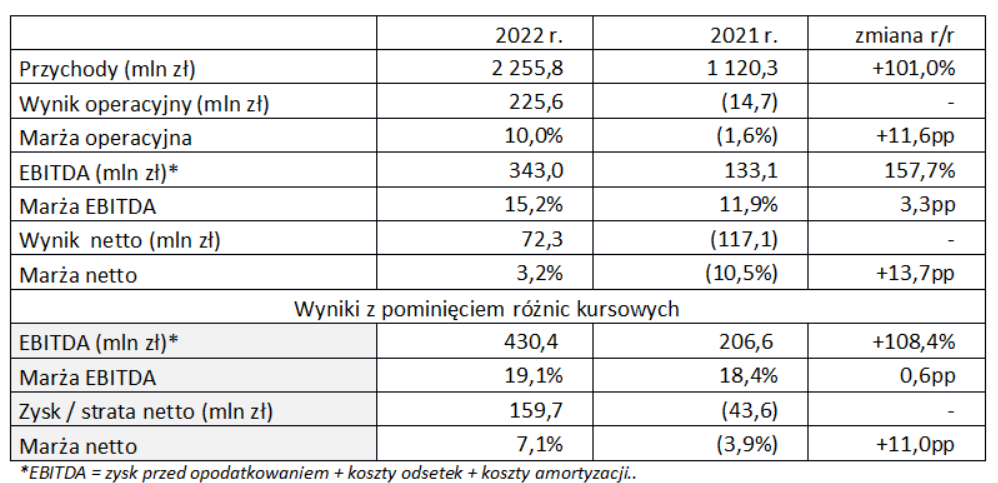 W 2022 r. dzięki odbudowie potencjału Grupy, zwiększonej liczby wykonywanych operacji lotniczych i utrzymaniu kosztów pod kontrolą Enter Air miał 225,6 mln zł zysku operacyjnego, w porównaniu do 14,7 mln zł straty operacyjnej rok wcześniej. Grupa wypracowała 72,3 mln zł zysku netto w porównaniu do 117,1 mln zł straty netto w 2021 r., EBITDA wyniosła 343,0 mln zł, czyli o 158% więcej wobec 133,1 mln zł EBITDA w 2021 r. Na prezentowane wyniki istotny wpływ miały ujemne różnice kursowe*, które wyniosły w 2022 r. 87,5 mln zł. Bez uwzględniania różnic kursowych Enter Air miał 430,4 mln zł EBITDA oraz 159,7 mln zł zysku netto.