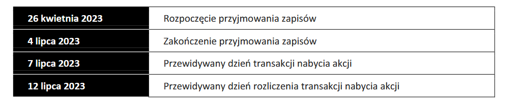 Najwięksi akcjonariusze i kluczowi menadżerowie TIM S.A. („Spółka”) posiadający łącznie ok. 42% ogólnej liczby akcji w kapitale zakładowym i ogólnej liczby głosów w Spółce, odpowiedzieli na wezwanie ogłoszone przez FEGA & Schmitt Elektrogroßhandel GmbH, spółkę należącą do Grupy Würth („Wzywający”) i złożyli zapisy po uzgodnionej z Wzywającym cenie 50,69 zł za akcję. Zapisy na sprzedaż akcji TIM S.A. będą przyjmowane do 4 lipca 2023 r.