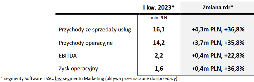 Wraz z segmentem marketingowym, przeznaczonym do sprzedaży w następstwie przeglądu opcji strategicznych, wyniki Grupy K2 to 19,2 mln zł kwartalnych przychodów operacyjnych (+19% rdr), 2,8 mln zł wyniku EBITDA (+0,2 mln zł rdr) i 2,2 mln zł zysku operacyjnego (+0,2 mln zł).