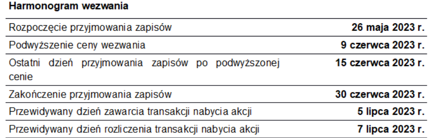 Zapisy na sprzedaż akcji w wezwaniu będą przyjmowane do 30 czerwca 2023 r.