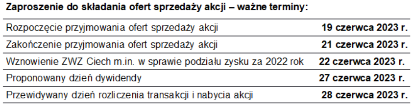 KI Chemistry proponuje, aby dzień dywidendy został wyznaczony na 27 czerwca, a jej wypłata nastąpiła 17 lipca 2023 r. Akcjonariusze Ciech, decydując się na sprzedaż akcji na rzecz KI Chemistry, zachowają prawo do dywidendy, gdyż planowanie rozliczenie transakcji nabycia akcji nastąpi 28 czerwca br. (dzień po dniu dywidendy).