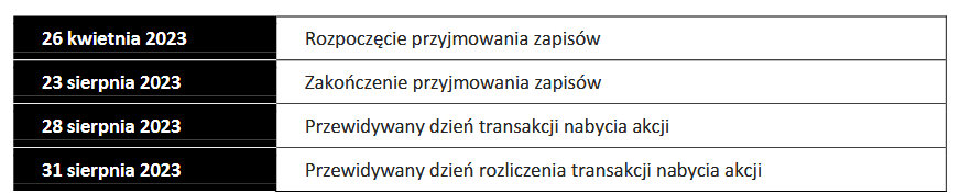 Od początku okresu przyjmowania zapisów w wezwaniu, zapisy na akcje przekroczyły ustalony w wezwaniu próg 50% ogólnej liczby głosów po ustalonej cenie 50,69 zł za akcję.