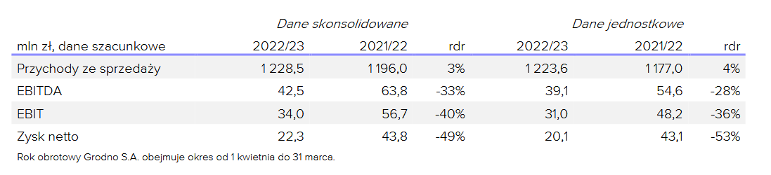 Zgodnie z szacunkami, w zakończonym w marcu roku obrotowym 2022/23, Grodno wypracowało 1,2 mld zł przychodów, które przełożyły się na 42,5 mln zł EBITDA, 34,0 mln zł EBIT oraz 22,3 mln zł zysku netto. Oznacza to rekordowy poziom sprzedaży, odnotowany przy jednoczesnym spadku pozycji wynikowych pod wpływem wyższych kosztów i presji konkurencyjnej.