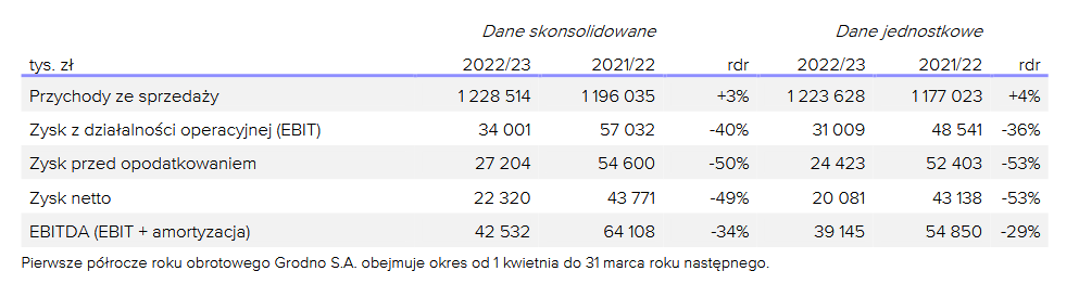 W zakończonym w marcu roku obrotowym 2022/23 Grodno odnotowało rekordowe 1,23 mld zł skonsolidowanych przychodów, przy spadku pozycji wynikowych pod wpływem trudnej sytuacji rynkowej. Okres ten Spółka ocenia jednak jako udany. „Grodno wzmocniło swoją pozycję rynkową, zwiększyło skalę działalności i sfinalizowało kluczowe inwestycje. Jesteśmy dobrze przygotowani na przyszłe wzrosty” – wyjaśnia Prezes Andrzej Jurczak.
