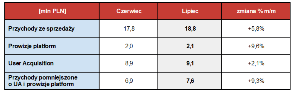 Grupa BoomBit miała w lipcu 2023 r. 18,8 mln PLN (+5,8%) przychodów ze sprzedaży. Wydatki na User Acquisition wzrosły do 9,1 mln PLN (+2,1%), a koszty prowizji platform do 2,1 mln PLN (+9,6%). Przychody Grupy BoomBit pomniejszone o UA i prowizje platform wyniosły 7,6 mln PLN (+9,3%), a liczba pobrań 15,4 mln.