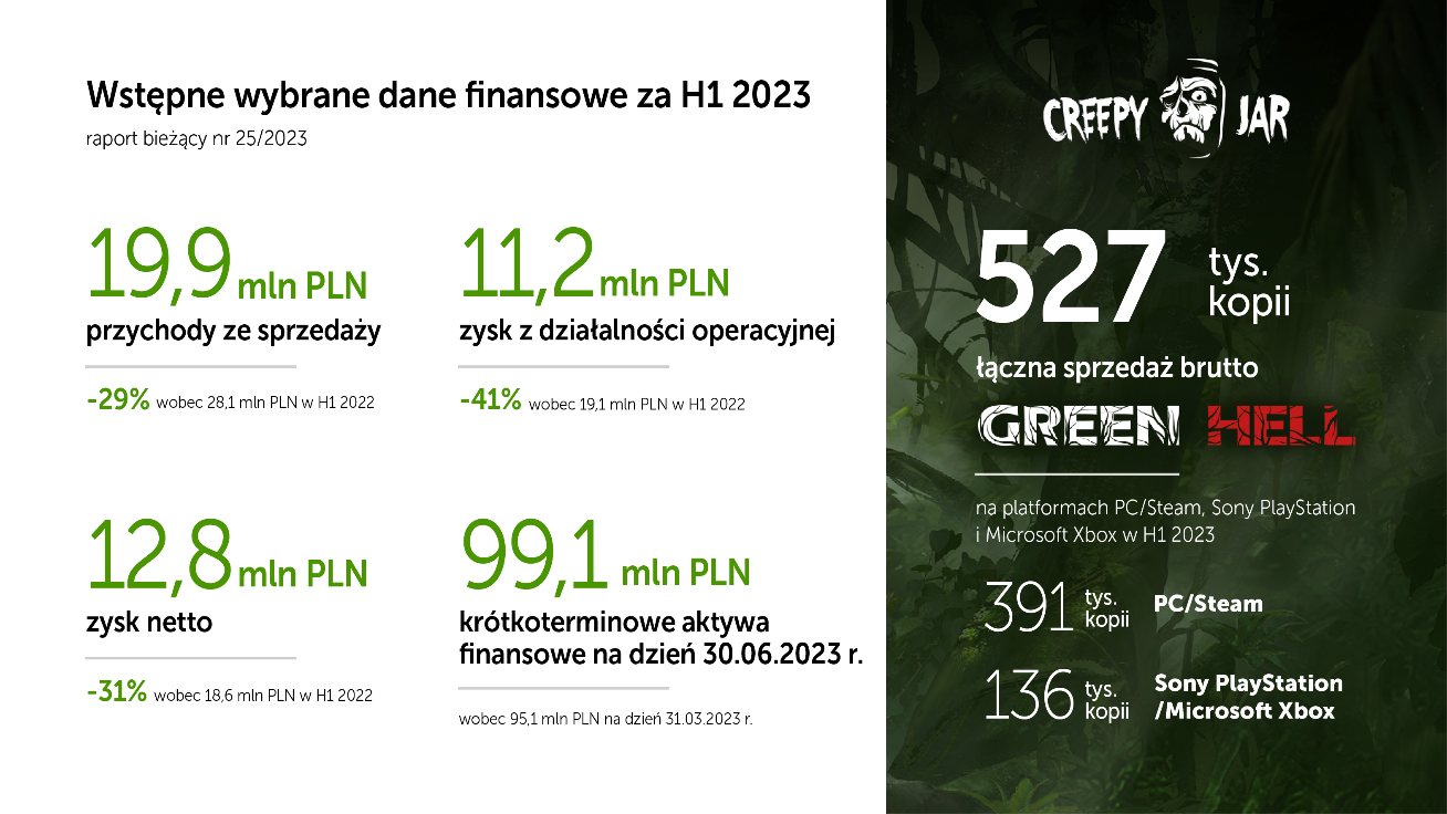 W 1 półroczu 2023 r. Creepy Jar S.A. wypracowała zysk operacyjny w kwocie 11,2 mln zł (spadek o 41% r/r) i zysk netto w wysokości 12,8 mln zł (spadek o 31% r/r). Osiągnięte przez spółkę wyniki finansowe są niższe r/r w efekcie malejącej sprzedaży gry Green Hell na wszystkich platformach, w szczególności na konsolach oraz platformach VR.