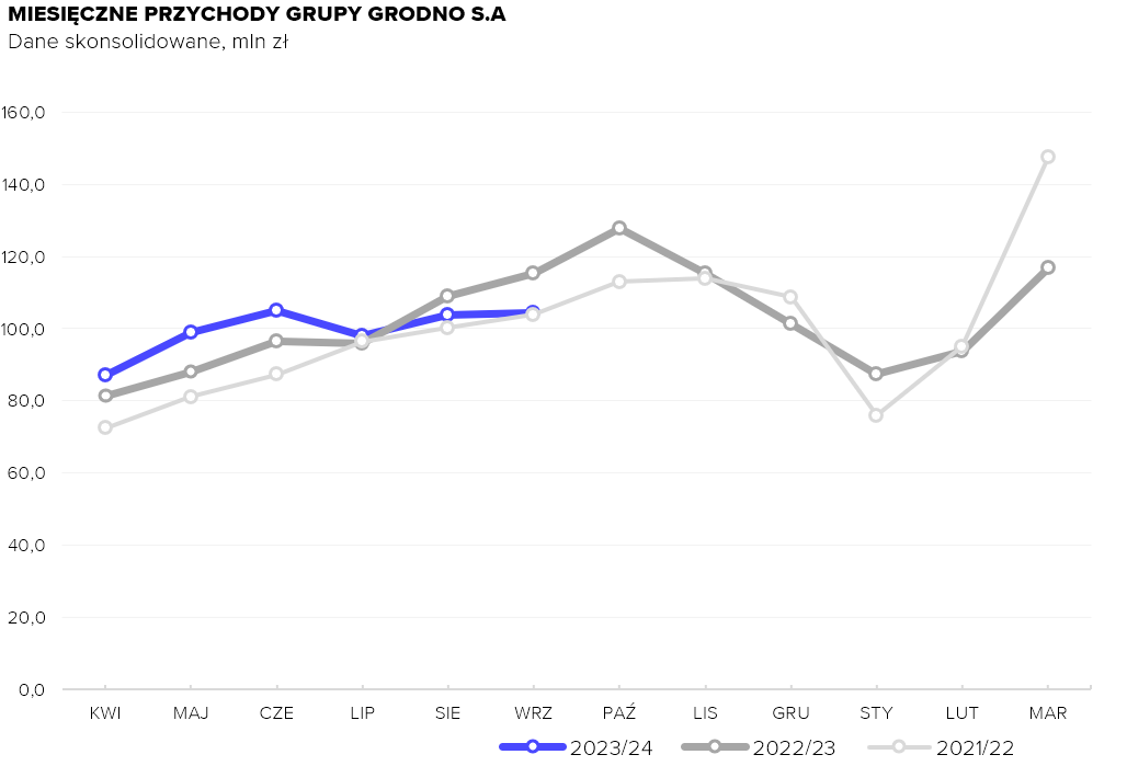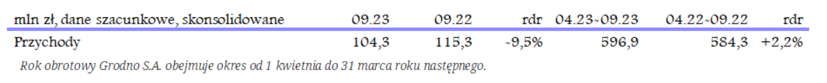 Zgodnie z najnowszymi szacunkami, we wrześniu Grodno wypracowało 104,3 mln zł skonsolidowanych przychodów, co oznacza spadek o 9,5% rdr. Narastająco po sześciu miesiącach bieżącego roku obrotowego przychody Grupy wyniosły rekordowe 596,9 mln zł, rosnąc o 2,2% rdr.
