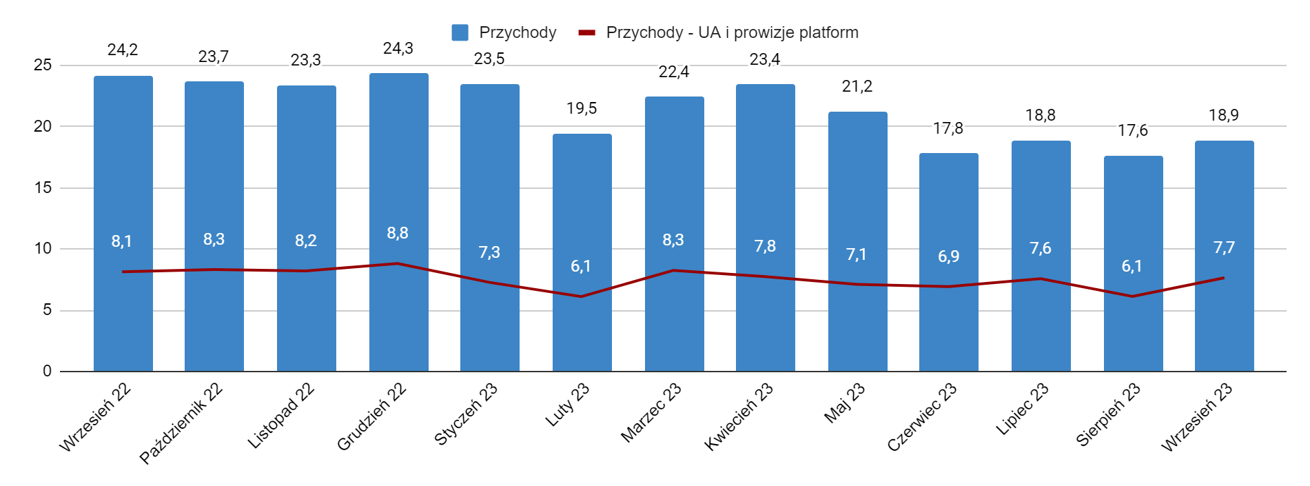 Przychody ze sprzedaży Grupy BoomBit we wrześniu 2023 r. wyniosły 18,9 mln PLN (+7,3%), w tym prawie 1,8 mln PLN z projektów blockchain. Wydatki na User Acquisition zmniejszyły się do 9,4 mln PLN (-2,2%), a koszty prowizji platform do 1,8 mln PLN (-0,6%). W rezultacie Grupa miała 7,7 mln PLN (+24,6%) przychodów pomniejszonych o UA i prowizje platform, a liczba pobrań wyniosła we wrześniu 13,3 mln.