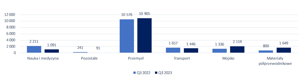 Sprzedaż detektorów i modułów detekcyjnych w III kwartale 2023 wyniosła łącznie 15,7 mln zł (-2% r/r), a sprzedaż materiałów półprzewodnikowych 1,6 mln zł (2-krotny wzrost r/r). W III kwartale 2023 największy wzrost sprzedaży w ujęciu rok do roku zanotował segment wojskowy (2,1 mln zł, wzrost o 58% r/r). Segment wojskowy w Polsce zanotował blisko pięciokrotny wzrost sprzedaży w ujęciu rok do roku, do 1,7 mln zł. Trend wzrostowy w tym segmencie jest związany z rosnącymi wydatkami państw na obronność, czego efekty widoczne są w przychodach segmentu już od kilku kwartałów. Narastająco za 9 miesięcy segment wojskowy zanotował 8,4 mln zł sprzedaży, co oznacza wzrost o 34% r/r.