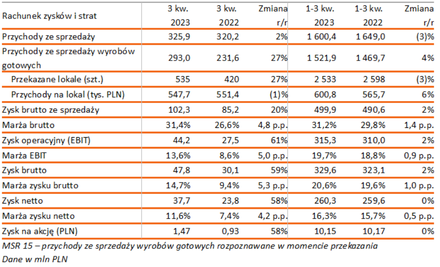 Poziom rozpoznanych przychodów w danym okresie zależy głównie od liczby lokali przekazanych nabywcom, a ta od harmonogramu realizowanych inwestycji. W trzecim kwartale 2023 roku klienci Grupy Dom Development otrzymali klucze do 535 lokali wobec 420 rok wcześniej, co oznacza wzrost o 27%. Przychody z tego tytułu (w sprawozdaniu finansowym określone jako „Przychody ze sprzedaży wyrobów gotowych”) również wzrosły o 27% r/r i sięgnęły 293 mln zł. Porównując poziom łącznych przychodów ze sprzedaży w omawianym okresie, należy pamiętać, że w trzecim kwartale 2022 roku Grupa również zanotowała znaczące przychody ze sprzedaży gruntów (63,3 mln zł).