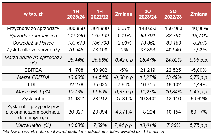 W samym II kwartale roku obrotowego 2023/24 przychody Grupy wyniosły 148,7 mln zł (-11%), a zysk netto był na poziomie ponad 19,3 mln zł (+59,6%).