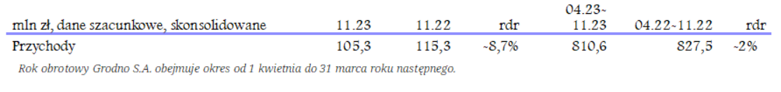 Zgodnie z najnowszymi szacunkami, w listopadzie skonsolidowane przychody Grodna wyniosły 105,3 mln zł, co oznacza spadek o 8,7% rdr. Narastająco po ośmiu miesiącach bieżącego roku obrotowego Grupa osiągnęła 810,6 mln zł przychodów, czyli o 2% mniej rdr.