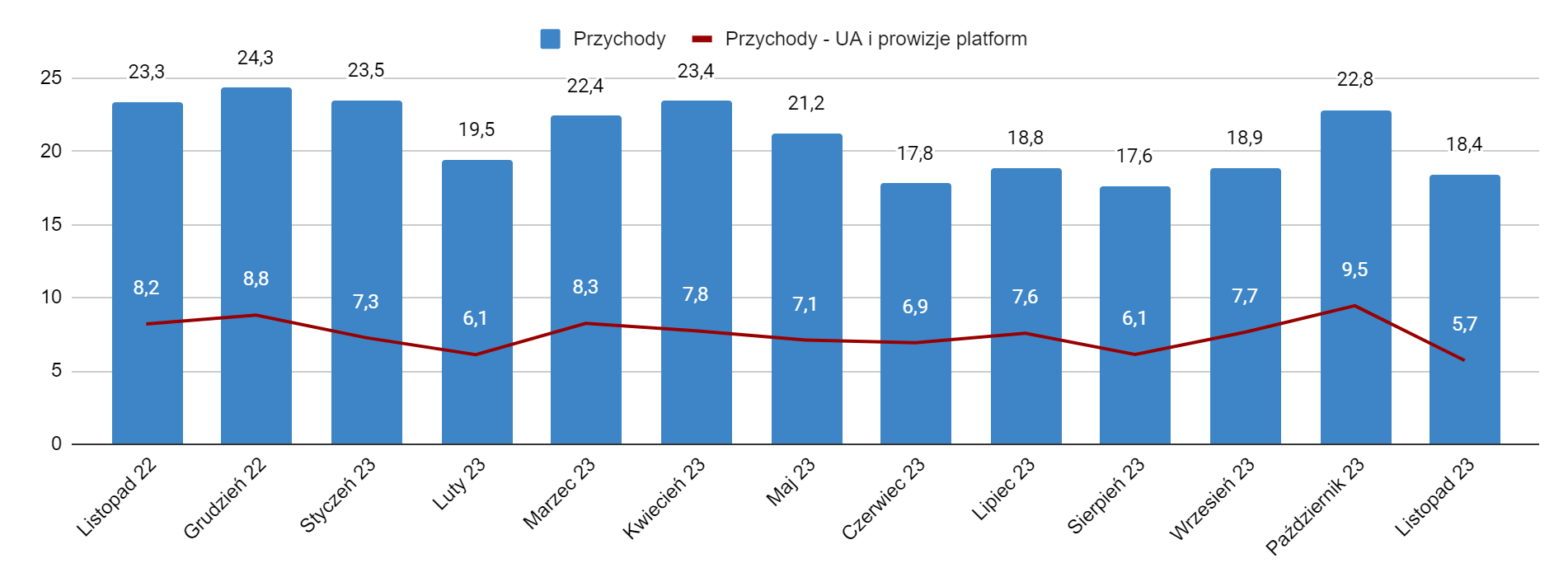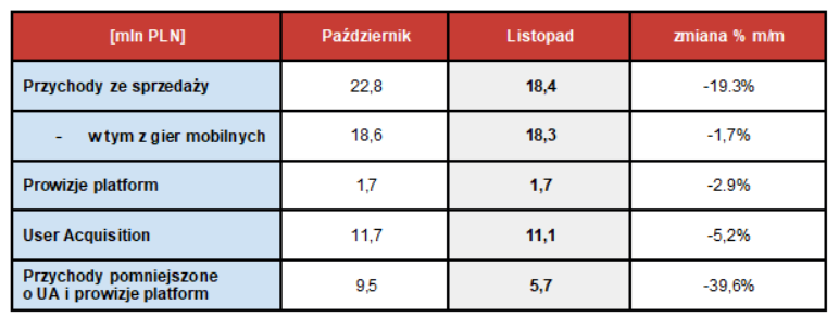 Przychody ze sprzedaży Grupy BoomBit w listopadzie 2023 r. wyniosły 18,4 mln PLN (-19,3%), w tym 18,3 mln PLN z gier mobilnych (-1,7%). Wydatki na User Acquisition zmniejszyły się do 11,1 mln PLN (-4,0%), a koszty prowizji platform były na podobnym poziomie jak miesiąc wcześniej i wyniosły 1,7 mln PLN (-2,9%). W rezultacie Grupa miała w listopadzie 5,7 mln PLN (-39,6%) przychodów pomniejszonych o UA i prowizje platform oraz 14.2 mln pobrań.