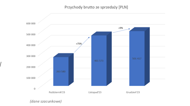 Porównanie szacunkowych wyników za grudzień 2023 w stosunku do średniomiesięcznych wyników spółki z okresu ostatnich trzech poprzedzających miesięcy wskazuje wzrost przychodów brutto ze sprzedaży o prawie 54% oraz wzrost liczby zamówień o ponad 49%.