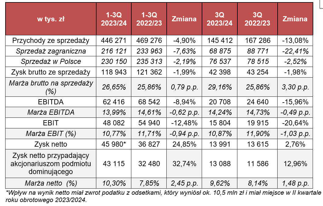 W samym III kwartale roku obrotowego 2023/24 przychody Grupy wyniosły 145,4 mln zł (-13,1%), a zysk netto był na poziomie blisko 14 mln zł (+2,7%).