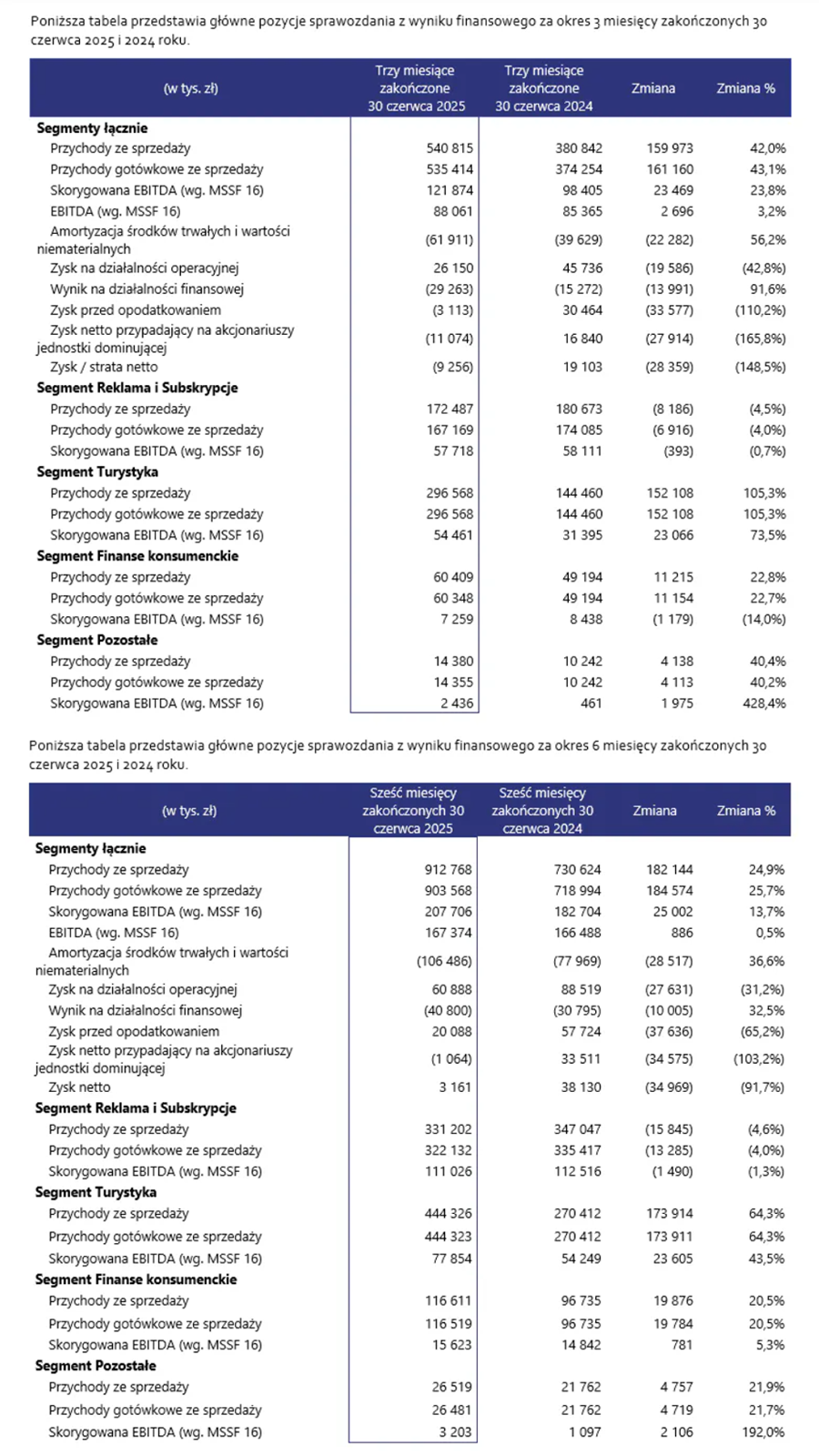 Łączne przychody gotówkowe w pierwszym półroczu 2025 roku przekroczyły 900 mln złotych, a w samym drugim kwartale wyniosły 535,4 mln złotych, o 43 % więcej niż przed rokiem. Skorygowany zysk EBITDA WP Holding w pierwszym półroczu to 207,7 mln złotych, o prawie 14% więcej niż rok wcześniej, z czego niemal 122 mln złotych przypadło na drugi kwartał. Segment turystyki, po finalizacji akwizycji Invia Group, w drugim kwartale wygenerował prawie 55 mln złotych skorygowanego zysku EBITDA po wzroście o 73,5 %. Przychody segmentu reklamy i subskrypcji utrzymały się na poziomie ubiegłego roku, a EBITDA tego segmentu była o 1% niższa niż rok wcześniej.