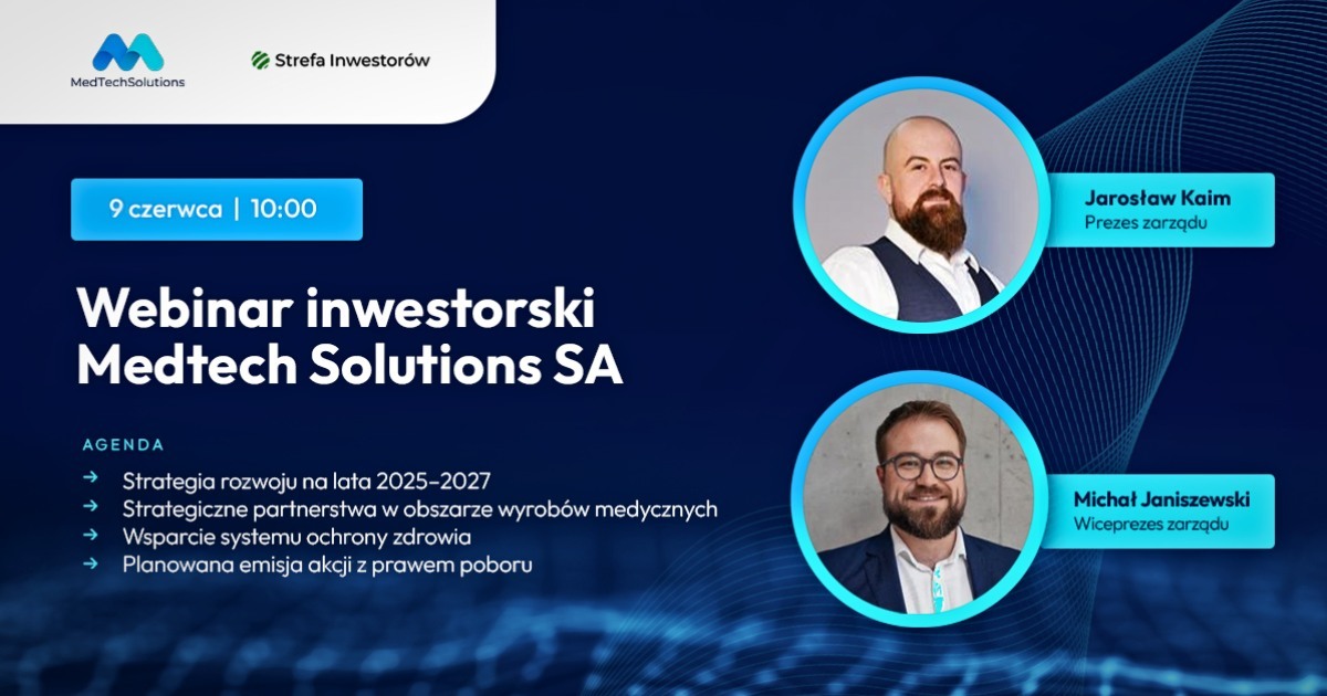 W poniedziałek 9 czerwca 2025 r. o godz. 10:00 zapraszamy na webinar z zarządem MedTech Solutions S.A.: Jarosławem Kaimem, prezesem zarzadu oraz Michałem Janiszewskim, wiceprezesem zarządu. Spotkanie będzie poświęcone zaktualizowanej strategii rozwoju na lata 2025–2027. Wymagana jest bezpłatna rejestracja.