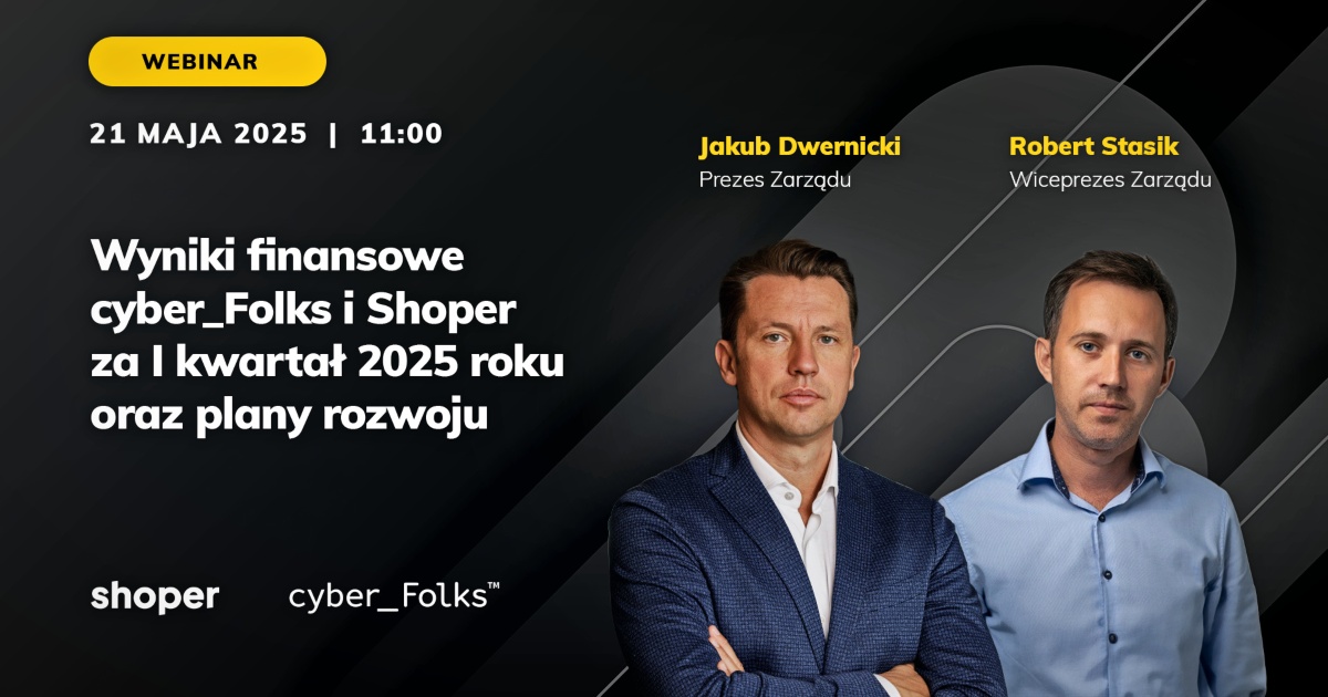 Wkrótce cyber_Folks i Shoper opublikuje wyniki finansowe za wspólny I kwartał 2025 roku. O nich oraz planach dalszego rozwoju będzie można posłuchać podczas webinaru, w którym udział weźmie zarząd spółki: