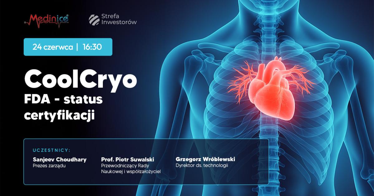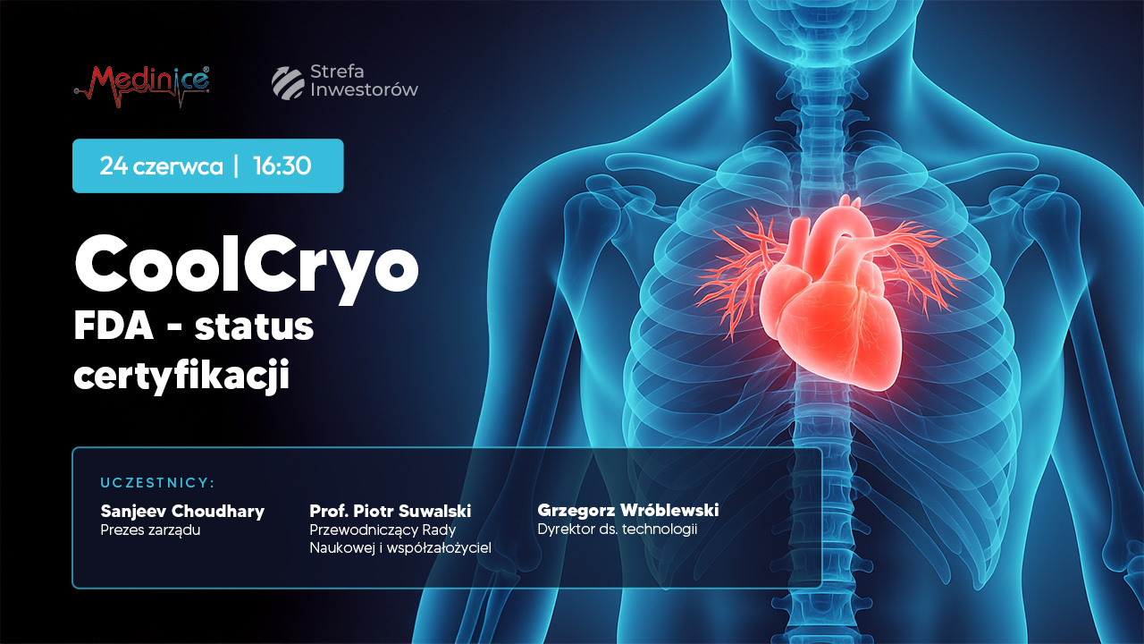 Medinice SA, innowacyjna spółka z sektora MedTech notowana na GPW, zaprasza inwestorów oraz przedstawicieli rynku kapitałowego na webinar inwestorski, którego tematem będzie aktualny status procesu certyfikacji FDA w projekcie CoolCryo – kluczowego etapu na drodze do komercjalizacji na rynku amerykańskim.