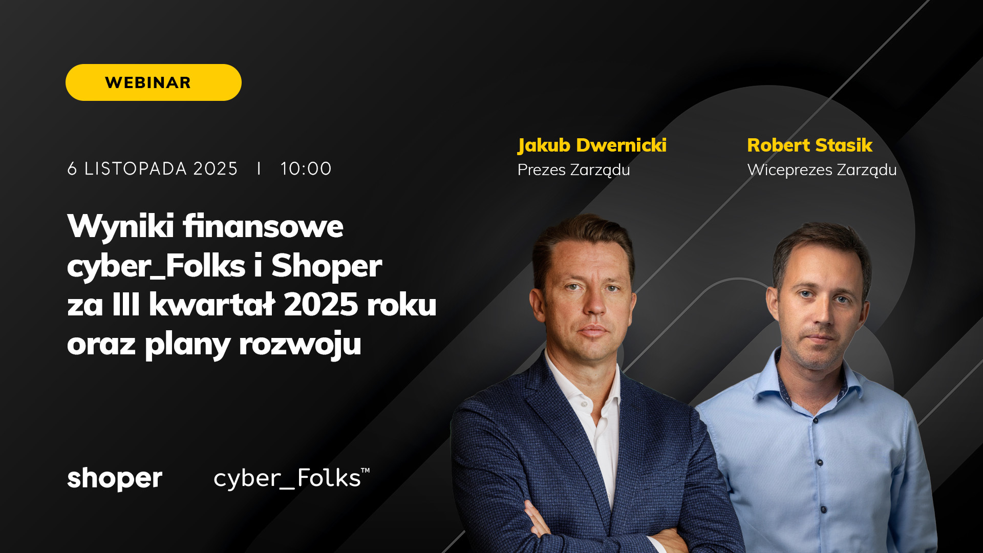 Już 5 listopada 2025 r. cyber_Folks i Shoper opublikują wyniki finansowe za III kwartał 2025 roku. O nich oraz planach dalszego rozwoju będzie można posłuchać podczas webinaru, w którym udział wezmą przedstawiciele obu spółek: Jakub Dwernicki, prezes zarządu cyber_Folks oraz Shoper i Robert Stasik, wiceprezes zarządu cyber_Folks oraz Shoper.