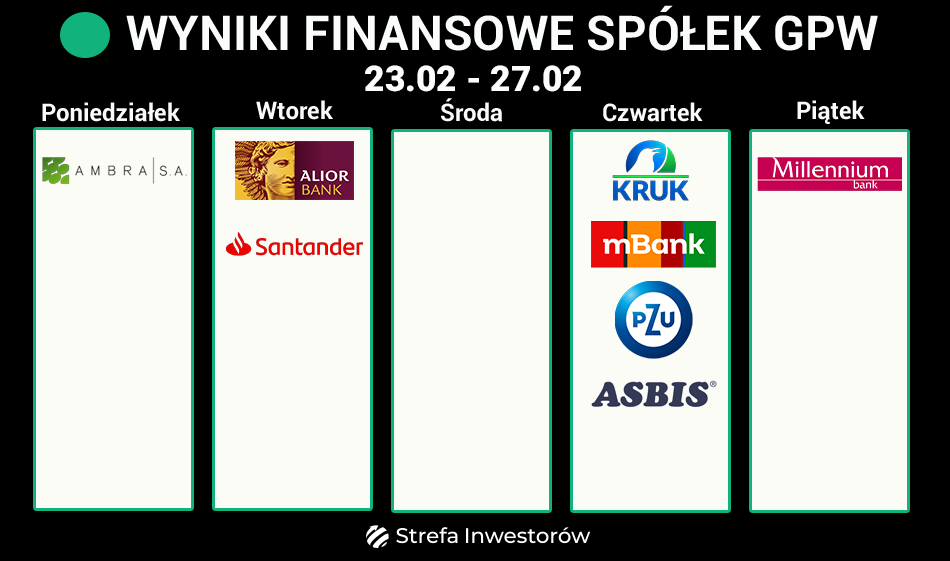 W piątek (27 lutego) raport roczny publikuje Bank Millennium z mWIG40. Wśród mniejszych podmiotów (głównie sWIG80) pojawi się kilka raportów kwartalnych, w tym najważniejszy z nich raport Apatora.