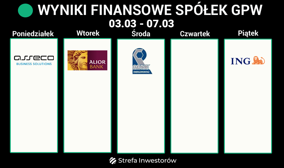 W poniedziałek, 3 marca, Asseco Business Solutions przedstawi swój raport roczny, a we wtorek, 4 marca, Alior Bank opublikuje swoje roczne sprawozdanie finansowe.