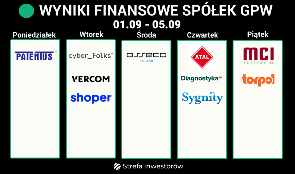 Na koniec tygodnia, w piątek, 5 września, zobaczymy raporty MCI Capital z sWIG80, który zaprezentuje wyniki półroczne z perspektywy private equity. Równolegle dane półroczne przedstawi Torpol, wykonawca infrastruktury kolejowej i tramwajowej, dostarczy.