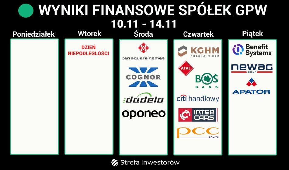 Zamknięcie krótkiego tygodnia wynikowego w piątek, 14 listopada zdominuje mWIG40 poprzez Benefit Systems, lidera benefitów pracowniczych i usług well‑being oraz Newag jako znaczący producent taboru kolejowego. W sWIG80 istotnymi punktami odniesienia będą Stalprodukt w stalach i wyrobach hutniczych, Sanok Rubber Company w wyrobach gumowych dla przemysłu motoryzacyjnego i energetyki, oraz Apator w aparaturze pomiarowej i automatyce.